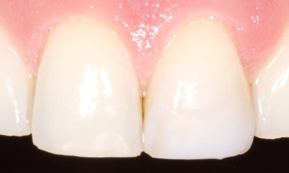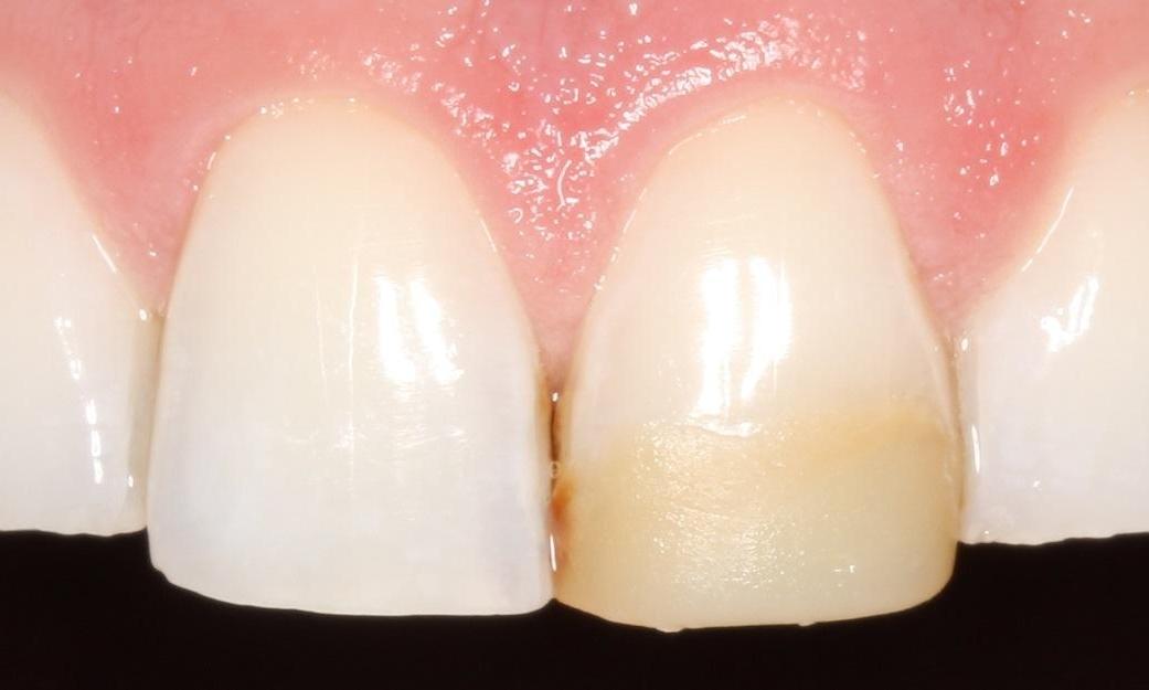 This 40-year-old male patient presented with discolored bonding from a previous injury that had been repaired many years ago.