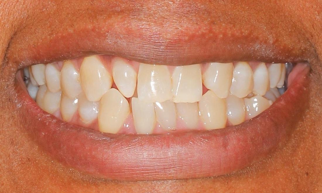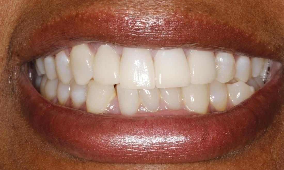 68 year old female was unhappy with her uneven smile. Porcelain veneers were placed on the front teeth to improve symmetry. Teeth whitening on the lower teeth was also performed.
