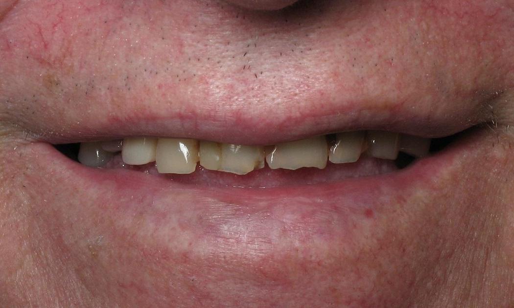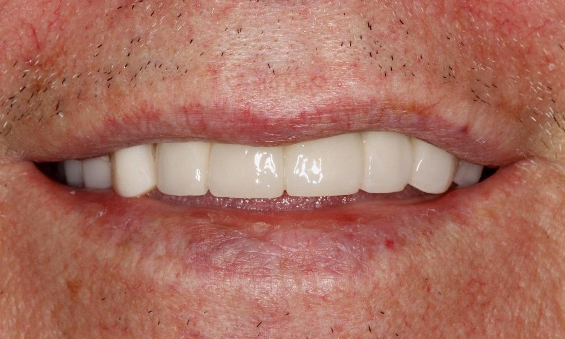 A 67 year old male had worn, chipped, uneven and decayed upper teeth. There were also several missing teeth. The smile was restored with a combination of porcelain crowns and bridges.