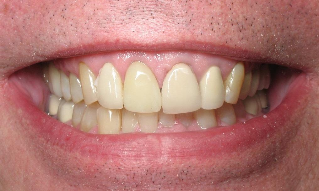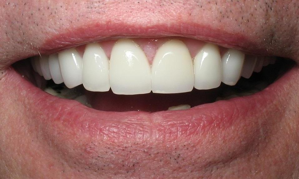 59 year old male had old dull looking porcelain crowns and veneers. He requested a lighter color to give a more youthful appearance.